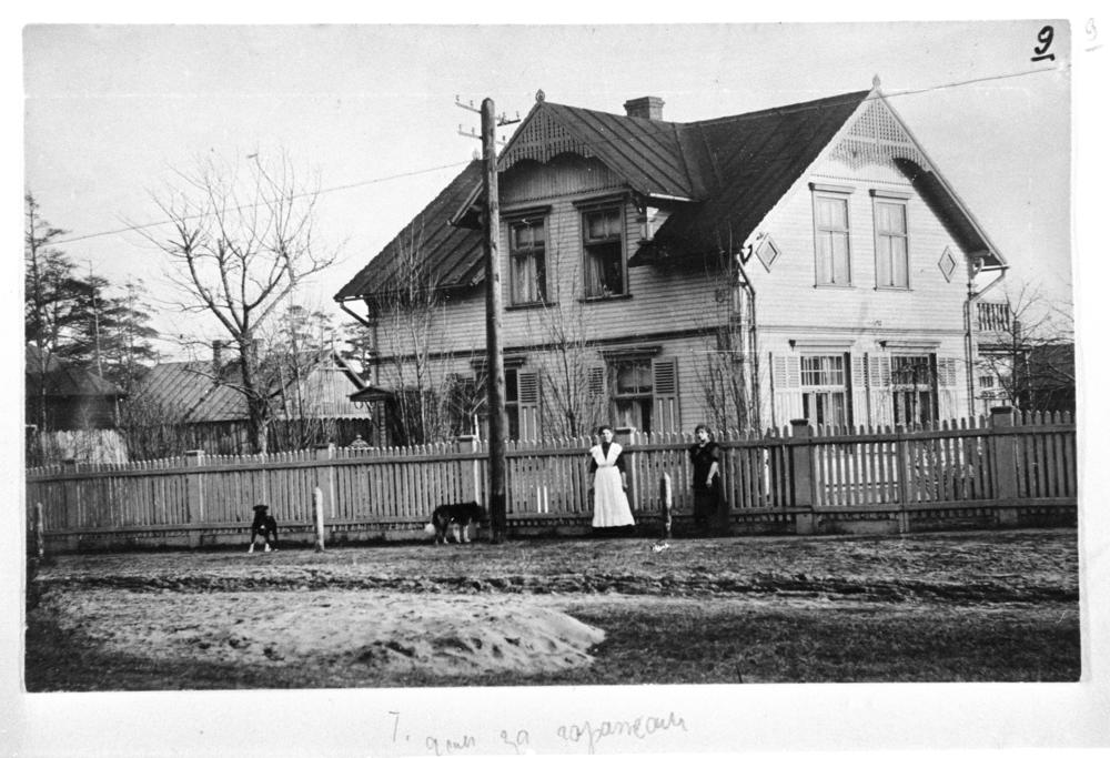 Skats uz dzīvojamo māju Mīlgrāvī. Uz ielas pie mājas stāv divas sievietes ar suņiem.