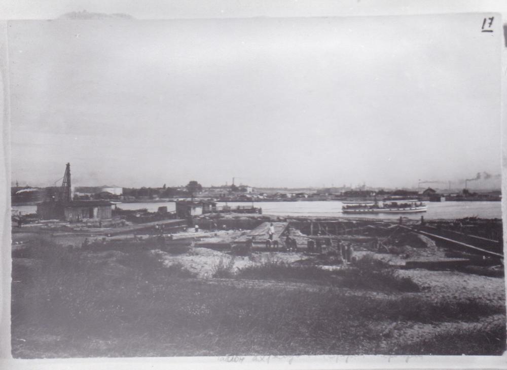 Skats uz "Cīzes kuģu būvētavas" ("Ziese Mühlgraben-Werft", saukta arī "F. Šichau Mīlgrāvja kuģu būvētava") celtniecības teritoriju. Kuģu būvētavu 1913. gadā izveidoja Karls Henrihs Cīze (Carl Heinrich Ziese) kā Vācijas kuģu būvētavas "Schichau-Werke" meitas uzņēmumu ar mērķi piekļūt Krievijas Impērijas ieroču tirgum būvējot galvenokārt karakuģus. 1915. gadā kuģu būvētava tika atsavināta un nonāca tiešā Krievijas Impērijas pārraudzībā. Pēc Latvijas Republikas neatkarības proklamēšanas 1925. gada 11. maijā uz statūtu pamata, pārņemot Cīzes kuģu būvētavas uzņēmumu ar visu tam piederošo nekustamu un kustamu mantu, tika izveidota akciju sabiedrība "Mīlgrāvja kuģu būvētavas un mašīnu fabrika". Fonā redzama Daugava.