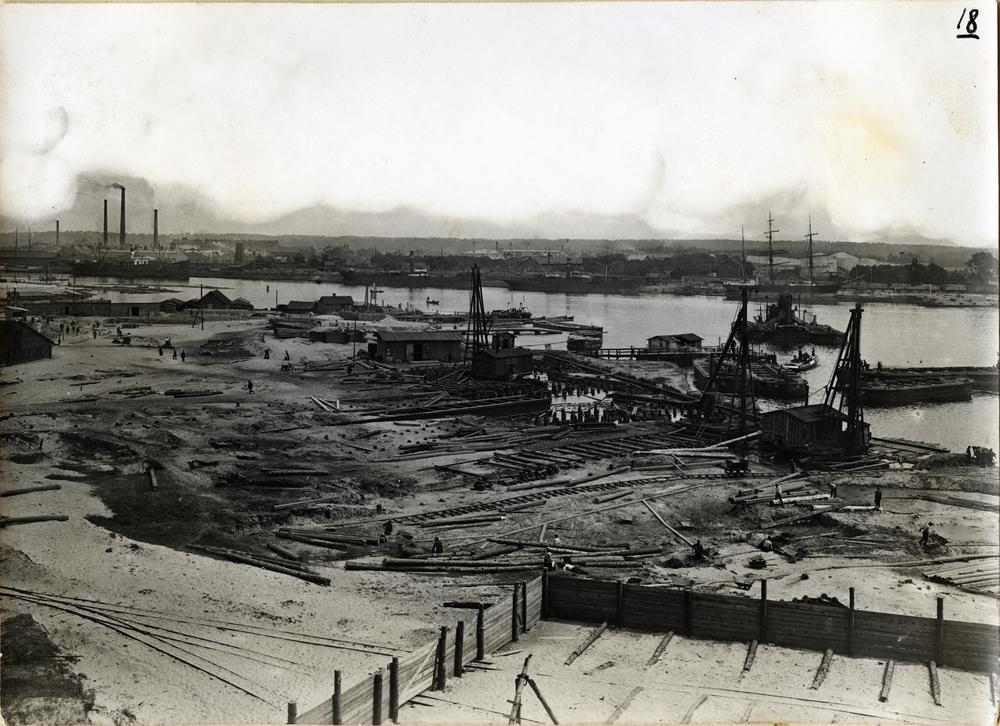 Skats uz "Cīzes kuģu būvētavas" ("Ziese Mühlgraben-Werft", saukta arī "F. Šichau Mīlgrāvja kuģu būvētava") celtniecības teritoriju. Kuģu būvētavu 1913. gadā izveidoja Karls Henrihs Cīze (Carl Heinrich Ziese) kā Vācijas kuģu būvētavas "Schichau-Werke" meitas uzņēmumu ar mērķi piekļūt Krievijas Impērijas ieroču tirgum būvējot galvenokārt karakuģus. 1915. gadā kuģu būvētava tika atsavināta un nonāca tiešā Krievijas Impērijas pārraudzībā. Pēc Latvijas Republikas neatkarības proklamēšanas 1925. gada 11. maijā uz statūtu pamata, pārņemot Cīzes kuģu būvētavas uzņēmumu ar visu tam piederošo nekustamu un kustamu mantu, tika izveidota akciju sabiedrība "Mīlgrāvja kuģu būvētavas un mašīnu fabrika". Fonā redzama Daugava.