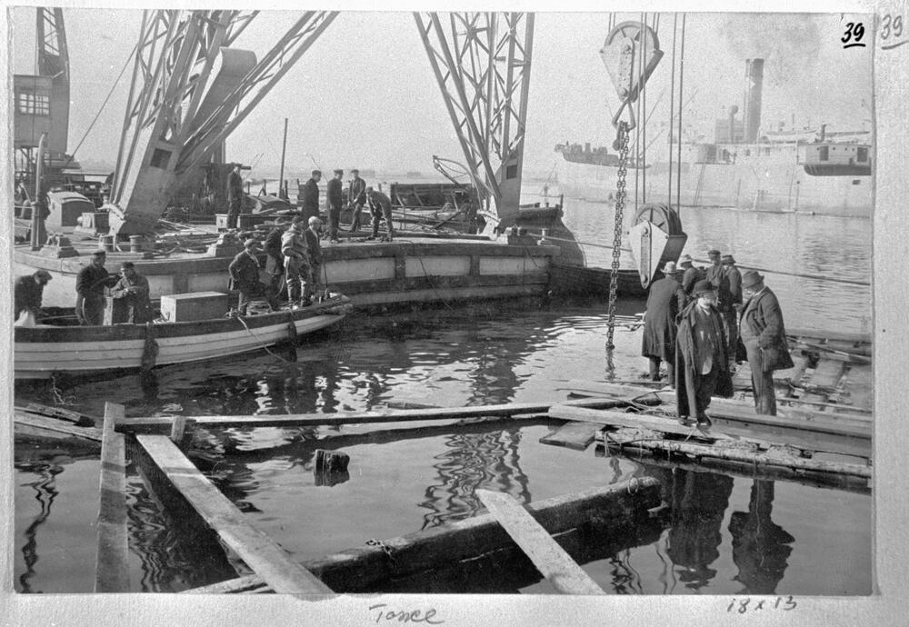 Ūdenslīdējs (fonā uz laivas gala) un strādnieki stāpeļu ceļu celtniecības laikā "Cīzes kuģu būvētavas" ("Ziese Mühlgraben-Werft", saukta arī "F. Šichau Mīlgrāvja kuģu būvētava") teritorijā. Kuģu būvētavu 1913. gadā izveidoja Karls Henrihs Cīze (Carl Heinrich Ziese) kā Vācijas kuģu būvētavas "Schichau-Werke" meitas uzņēmumu ar mērķi piekļūt Krievijas Impērijas ieroču tirgum būvējot galvenokārt karakuģus. 1915. gadā kuģu būvētava tika atsavināta un nonāca tiešā Krievijas Impērijas pārraudzībā. Pēc Latvijas Republikas neatkarības proklamēšanas 1925. gada 11. maijā uz statūtu pamata, pārņemot Cīzes kuģu būvētavas uzņēmumu ar visu tam piederošo nekustamu un kustamu mantu, tika izveidota akciju sabiedrība "Mīlgrāvja kuģu būvētavas un mašīnu fabrika".