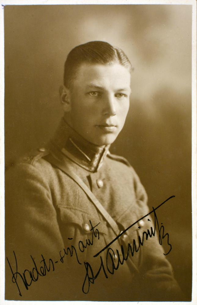 Latvijas armijas Jātnieku pulka kadets - seržants Arnolds Tauniņš. 1920. gada 15. oktobrī Kara skolas jātnieku nodaļas kadets. 1921. gadā 1. novembrī kļuva par armijas kaprālis. 1922. gadā 1. septembrī beidzis Kara skolu ar III šķiru, kadets seržants. 1922. gada 1. septembrī kļuva par Jātnieku pulka Eskadrona (III) instruktors. 1923. gada 23. jūlijā paaugstināts leitnanta pakāpē. 1923. gada 23. jūlijā kļuva par Eskadrona (III) jaunāko virsnieku. 1924. gada 29. februārī apbalvots ar Latvijas atbrīvošanas kara piemiņas zīmi. 1924. gada 29. februārī kļūst par vada komandieri. 1924. gada 16. augusts bija atvaļināts. 1928. apbalvots ar Latvijas atbrīvošanas cīņas 10. gadu jubilejas medaļu. No 1929. - 1940. gadam Aizsargu organizācijas dalībnieks. 1929. gada 7. februārī kļuva par Rīgas V aizsargu pulka Sakaru bataljona Rotas (II) komandieris. 1930. gadā 13. novembrī apbalvots ar Triju Zvaigžņu ordeņa V šķīru. 1932. gada apbalvots ar Somijas aizsargu Nopelnu krusta III šķiru. 1934. gadā apbalvots ar Aizsargu organizācijas „Nopelnu krustu”. 1935. gadā apbalvots ar Somijas aizsargu Nopelnu medaļu. 1937. gada 18. janvārī iecelts par Rīgas aizsargu pulka riteņbraucēju rotas komandieri. 1940. gada 1. maijā apbalvots ar Igaunijas aizsargu Balta krusta III šķiru. 1940. gada 11. maijā apbalvots ar Viestura ordeņa V šķiru ar šķēpiem. Latvijas šaušanas organizācijas valdes loceklis. Portrets.