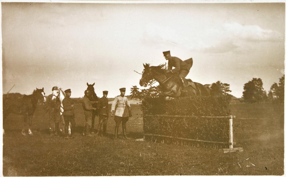 Latvijas armijas Jātnieku pulka treniņš jāšanas sportā, kur jātnieks ar zirgu lec pāri šķērslim. Fonā redzami citi jātnieki ar saviem zirgiem.