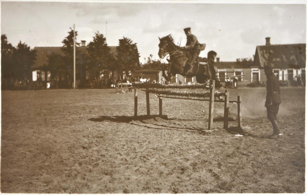Sacensības jāšanas sportā par godu Latvijas armijas Jātnieku pulka pastāvēšanas 5. gadadienai. Sacensību dalībnieks ar zirgu lec pāri šķērslim.