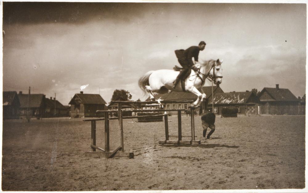 Latvijas armijas Jātnieku pulka treniņi jāšanas sportā. Pulka karavīrs ar zirgu lec pāri šķērsli.