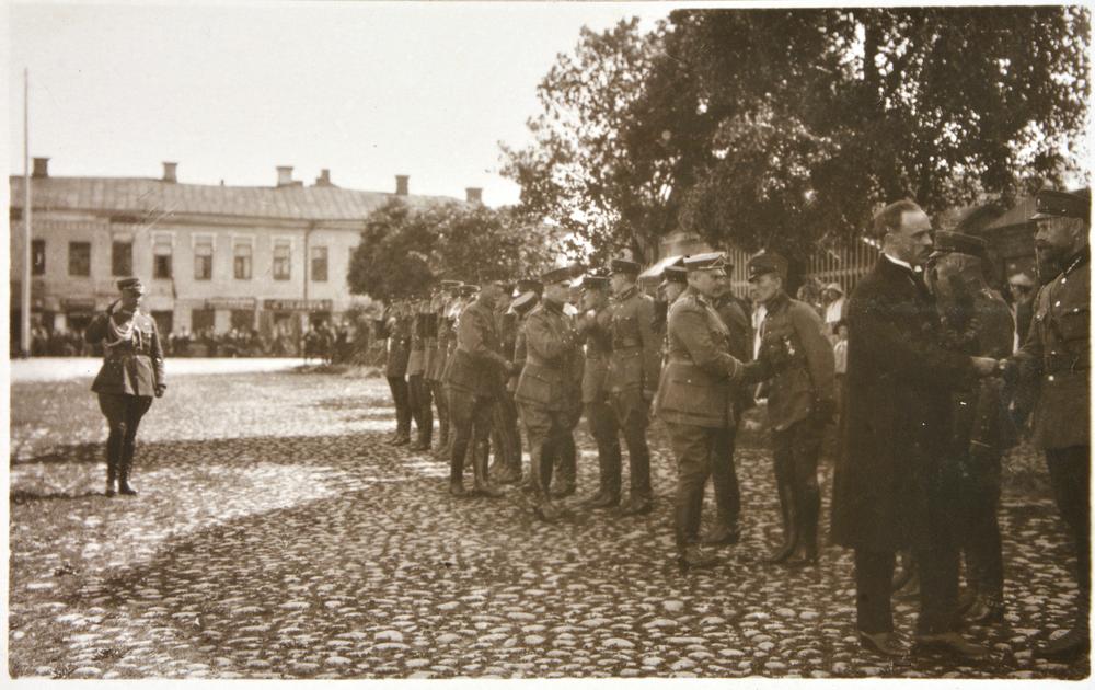 Latvijas armijas Jātnieku pulka virsnieki parādē par godu pulka pastāvēšanas 5. gadadienai.