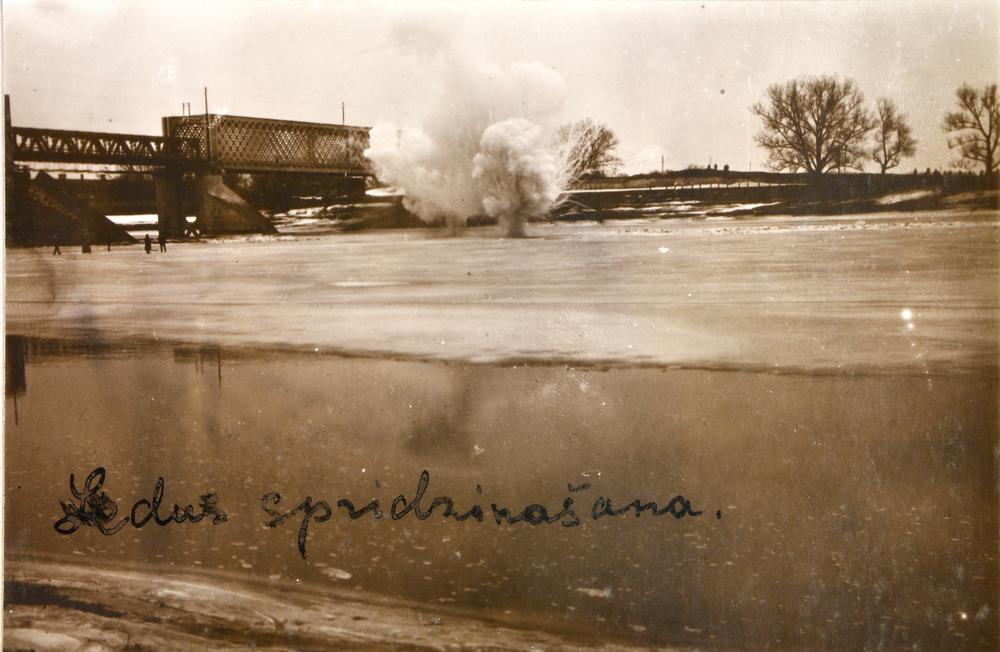 Latvijas armijas Jātnieku pulka spridzinātāju komandas praktiskā nodarbība, kuras laikā notika ledus spridzināšana. Fonā redzams Daugavpils dzelzceļa tilts un Latvijas armijas Jātnieku pulka spridzinātāju komandas četri dalībnieki, kas vēro sprādziena norisi.