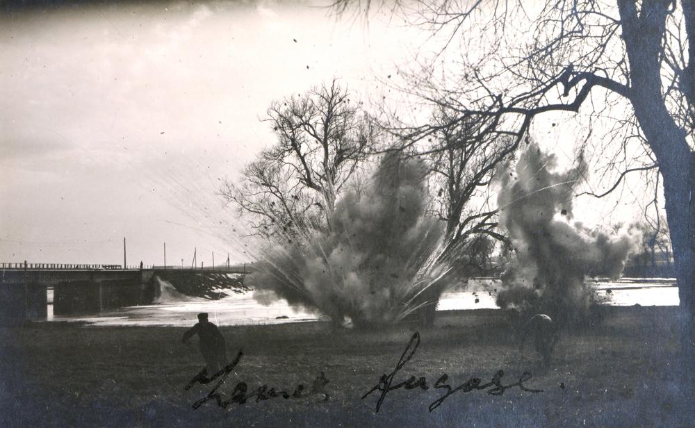 Latvijas armijas Jātnieku pulka spridzinātāju komandas praktiskā nodarbība. Fotogrāfijā redzams sprāgstvielas detonācijas moments "Zemes fugase". Priekšplānā divi karavīri, kas bēg no sprādziena vietas. Fonā redzams tilts pāri Daugavai.