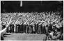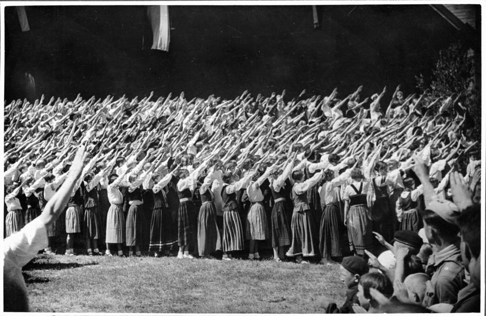 Bērnu svētkos Saules dārzā svētku dalībnieki sveic Latvijas Valsts un Ministru prezidentu Kārli Ulmani.