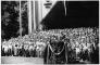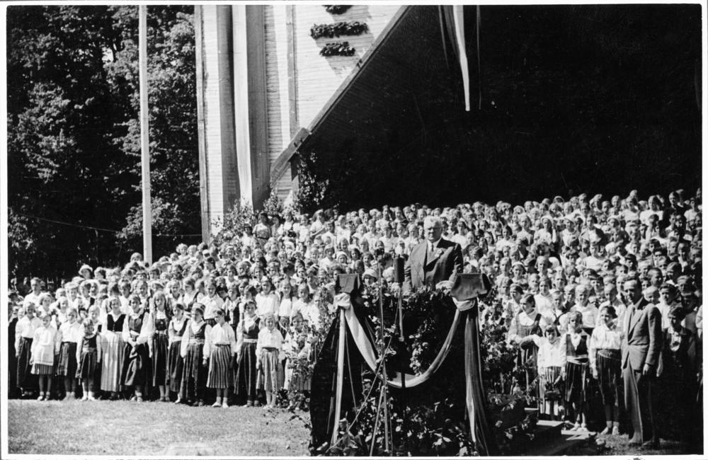 Bērnu svētkos Saules dārzā Latvijas Valsts un Ministru prezidents Kārlis Ulmanis no tribīnes uzrunā svētku dalībniekus. Estrādē skolēnu koris.