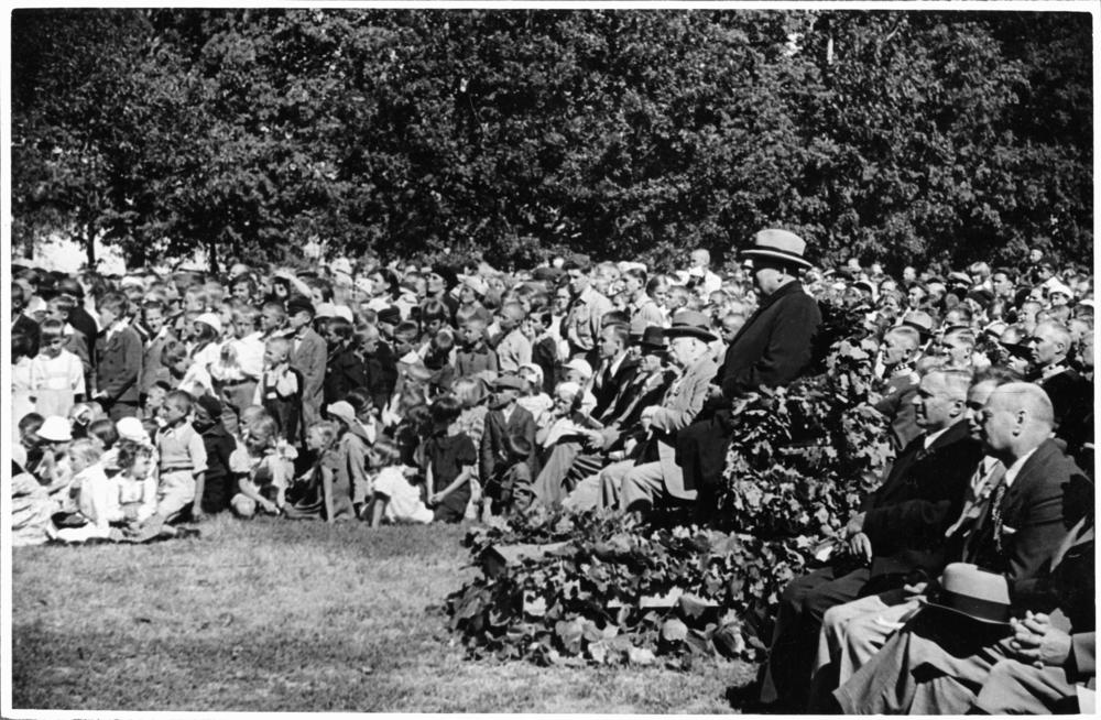 Bērnu svētku atklāšana Saules dārzā. Priekšnesumus vēro valdības pārstāvji. No labās sēž: 3. Latvijas Valsts un Ministru prezidents Kārlis Ulmanis, 4. Izglītības ministrs Augusts Tentelis.