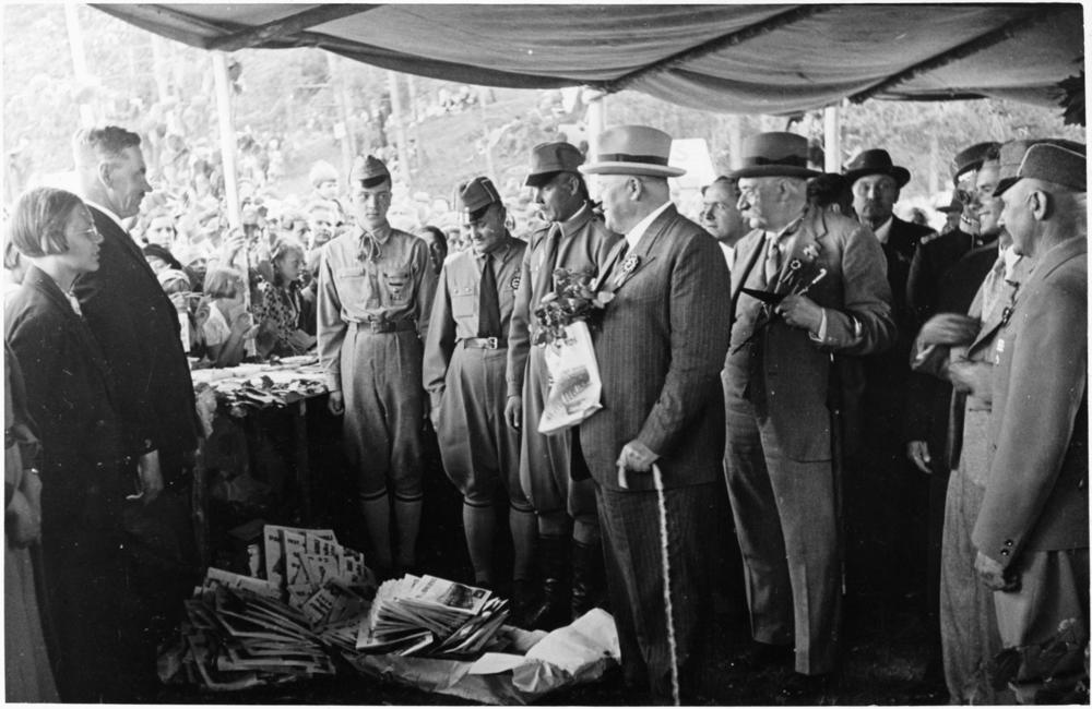Bērnu svētkos Saules dārzā Latvijas Valsts un Ministru prezidents Kārlis Ulmanis apmeklē mazpulku novietni. Prezidentam aiz muguras Izglītības ministrs Augusts Tentelis.