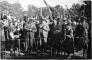 Bērnu svētkos Saules dārzā goda viesi un svētku norises dalībnieki vēro bērnu skrējienu pa "labirintu". Pirmā rindā no labās puses: 1. Bērnu svētku novietņu pārzinis, skolotājs Pēteris Džindža, 5. Latvijas Valsts un Ministru prezidents Kārlis Ulmanis, 6. Izglītības ministrs Augusts Tentelis.