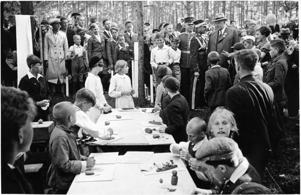 Bērnu svētkos Saules dārzā goda viesi un svētku norises dalībnieki vēro kā bērni veido māla figūriņas svētku "mazbērnu" novietnē. Galda galā, kreisajā pusē skatītāju vidū: Latvijas Valsts un Ministru prezidents Kārlis Ulmanis, Latvijas Valsts prezidenta adjutants, pulkvežleitnants Miervaldis Lūkins, Rīgas pilsētas prefekts Pēteris Pommers un Bērnu svētku novietņu pārzinis, skolotājs Pēteris Džindža.