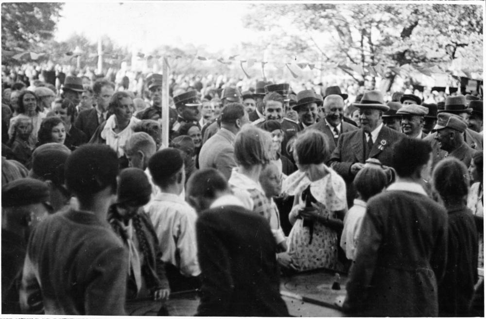 Bērnu svētkos Saules dārzā Latvijas Valsts un Ministru prezidents Kārlis Ulmanis iepazīstas ar bērnu nodarbībām un spēlēm.