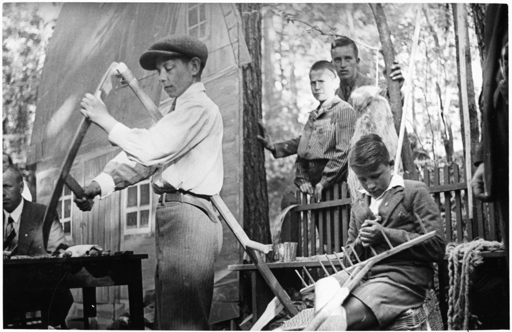 Bērnu svētkos Saules dārzā svētku novietnē "Lauku sēta" viens zēns asina izkapti, bet otrs - liek grābeklim jaunus zarus.