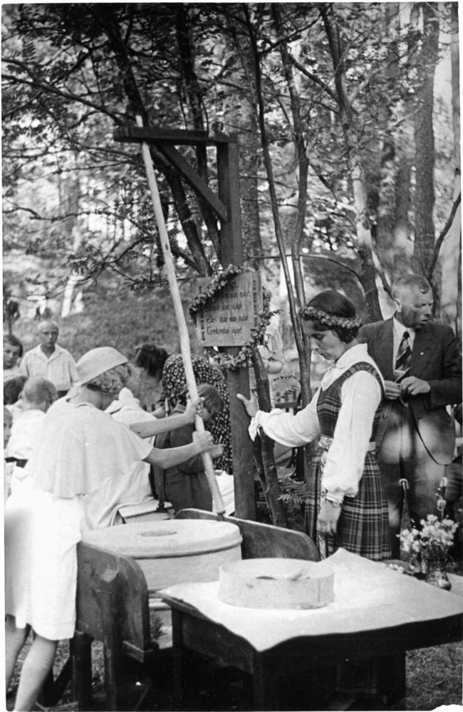 Bērnu svētkos Saules dārzā novietnē "Lauku sēta" pasākuma apmeklētāja griež smago dzirnu ratu.