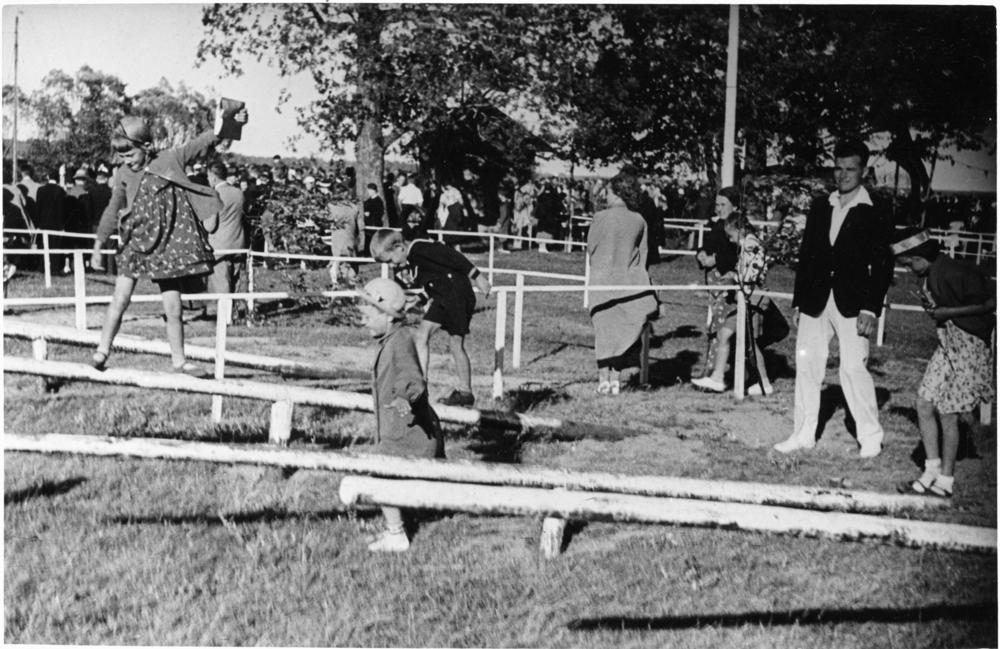 Bērnu svētkos Saules dārzā bērnu sporta nodarbības uz līdzsvara pārbaudīšanu.