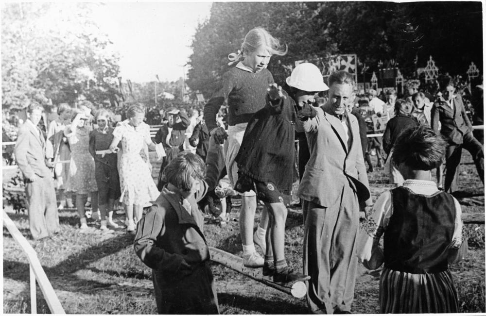 Bērnu svētkos Saules dārzā bērni piedalās sporta nodarbības, kurās pārbauda spēju noturēt līdzsvaru.