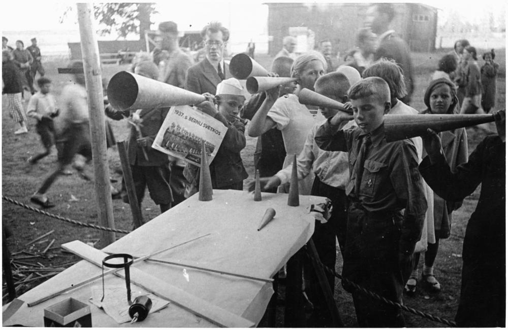 Bērnu svētkos Saules dārzā novietne, kur bērni klausās ar palīgierīcēm.