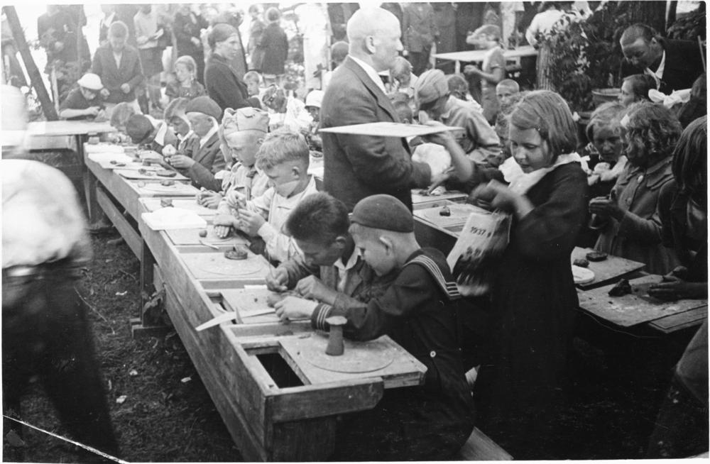 Bērnu svētkos Saules dārzā bērni piedalās nodarbības veidošanā no māliem.