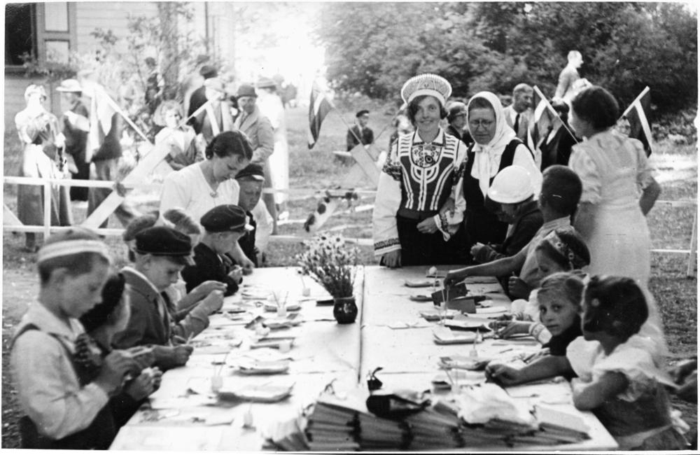 Bērnu svētkos Saules dārzā bērni piedalās nodarbībās rotu darināšanā. Galda galā no kreisās: 3. pirmsskolas vecuma bērnu pedagoģe Marta Rinka.