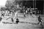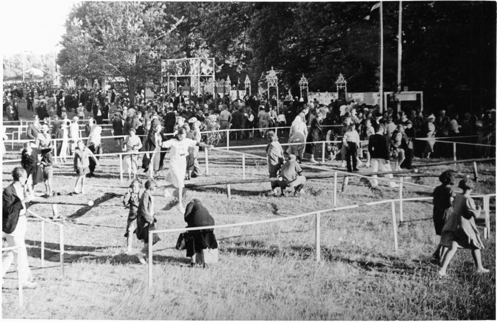 Bērnu svētkos Saules dārzā bērni uz līdzsvara baļķa.