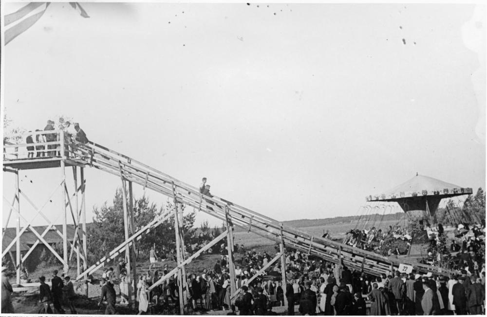 Bērnu svētkos Saules dārzā pasākuma dalībnieku izpriecas - braukšana no slidkalniņa un vizināšanās karuselī.