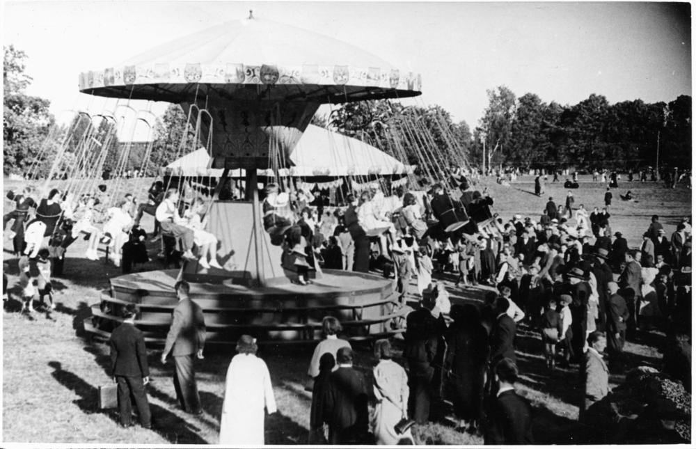 Bērnu svētkos Saules dārzā pasākuma dalībnieku izpriecas: vizināšanās ar karuseli.