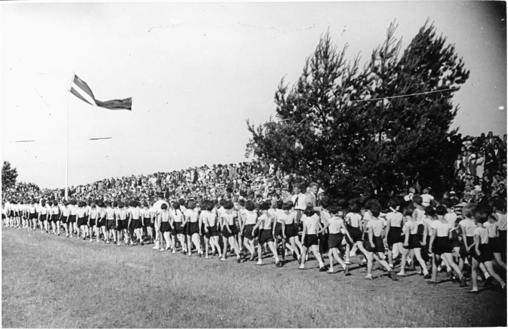 Bērnu svētkos Saules dārzā pamatskolu audzēkņi vingrotāju parādē.