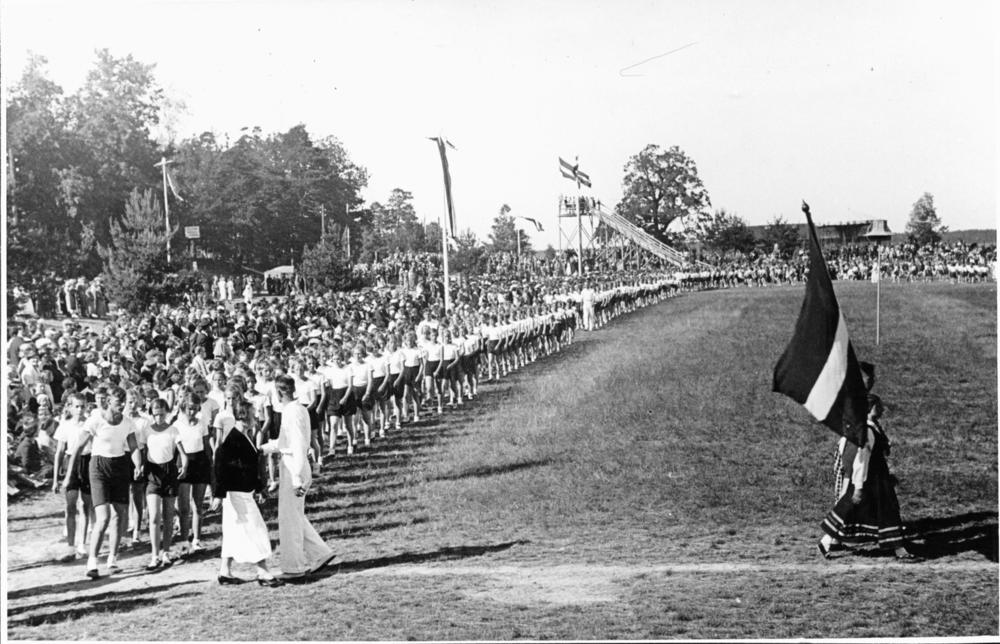 Bērnu svētkos Saules dārzā vingrotāju kolonnas parādē ar Latvijas valsts karogu priekšgalā.