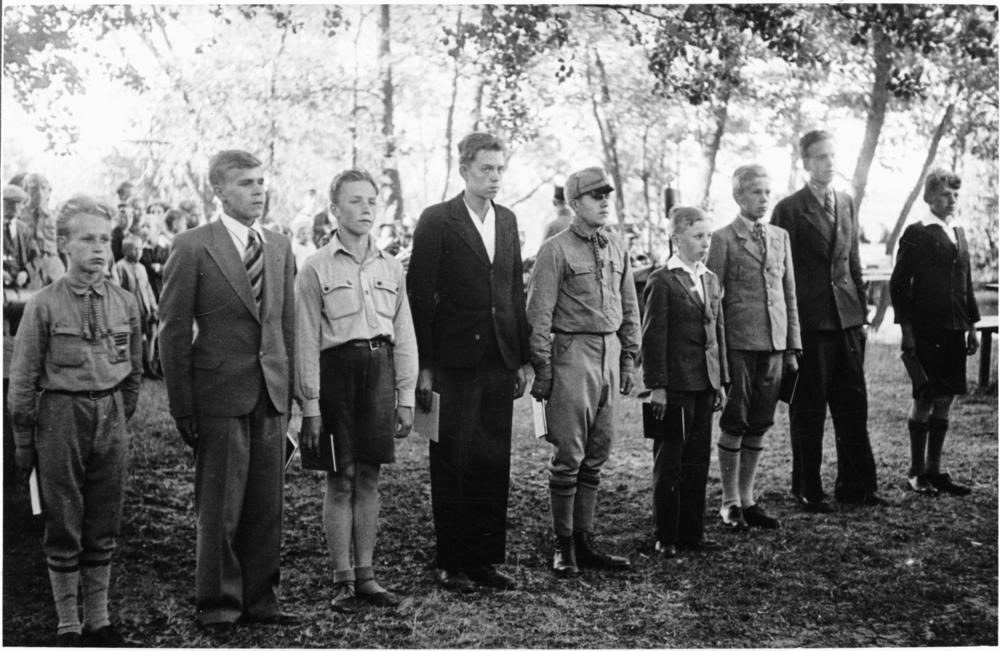 Bērnu svētkos Saules dārzā šaušanas sacensību uzvarētāji no kreisās puses: 1. A. Kreišmanis, 2. V. Volkovs, 3. Z. Cukainis, 4. P. Skangals, 5. A. Dzilna, 6. T. Dementjevs, 7. T. Uzkalns, 8. E. Liepiņš, 9. A. Liepiņš.