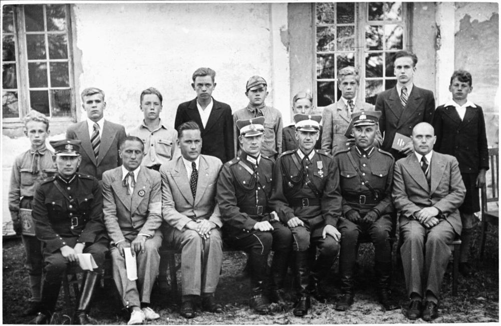Bērnu svētkos Saules dārzā šaušanas sacensību uzvarētāji un vadītāji. Pirmā rindā no kreisās: 1. virsleitnants Rudzītis, 2. svētku laukuma komendants, virsleitnants A. Lukstiņš, 3. Pulkveža Zemitāna mazpulka vadītāja palīgs J. Zentelis, 4. kapteinis Alfons Ķikuts, 5. militārās audzināšanas inspektors, pulkvežleitnants Žanis Eduards (?) Sproģis, 6. virsleitnants Rolands (?) Ramans, 7. Pulkveža Zemitāna pamatskolas pārzinis Jānis Šeniņš. Otrā rindā no kreisās (sacensību uzvarētāji): 1. A. Kreišmanis, 2. V. Volkovs, 3. Z. Cukainis, 4. P. Skangals, 5. A. Dzilna, 6. T. Dementjevs, 7. T. Uzkalns, 8. E. Liepiņš, 9. A. Liepiņš.