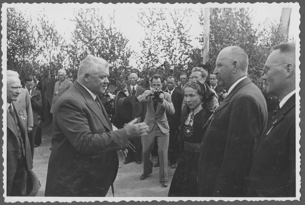 Latvijas Valsts un Ministru prezidents Kārlis Ulmanis un pasākuma goda viesi dodas uz spēkstacijas pamatakmens likšanas svinību vietu Daugavas krastā. Prezidentu sveic Ķeguma spēkstacijas būvinspektora palīgs Pēteris Stakle un ziņo, ka pamatakmens guldīšanai viss sagatavots. Priekšplānā no kreisās: 1. Ķeguma spēkstacijas būvinspektors inženieris Mārtiņš Robs, 2. Kārlis Ulmanis, 3. Pēteris Stakle, 4. Ķeguma spēkstacijas būvinspekcijas finanšu inspektors Gustavs Feigmanis.