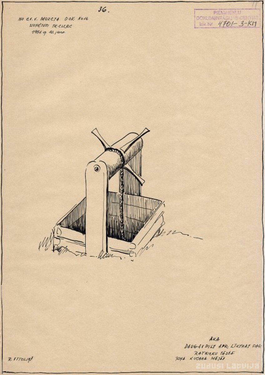 19. gadsimta nogales aka ar 1 trisinu (grodi), 2 stulpiem, 3 rogutiem, 4 bluķiem un 5 karakiem (ķēdēm)