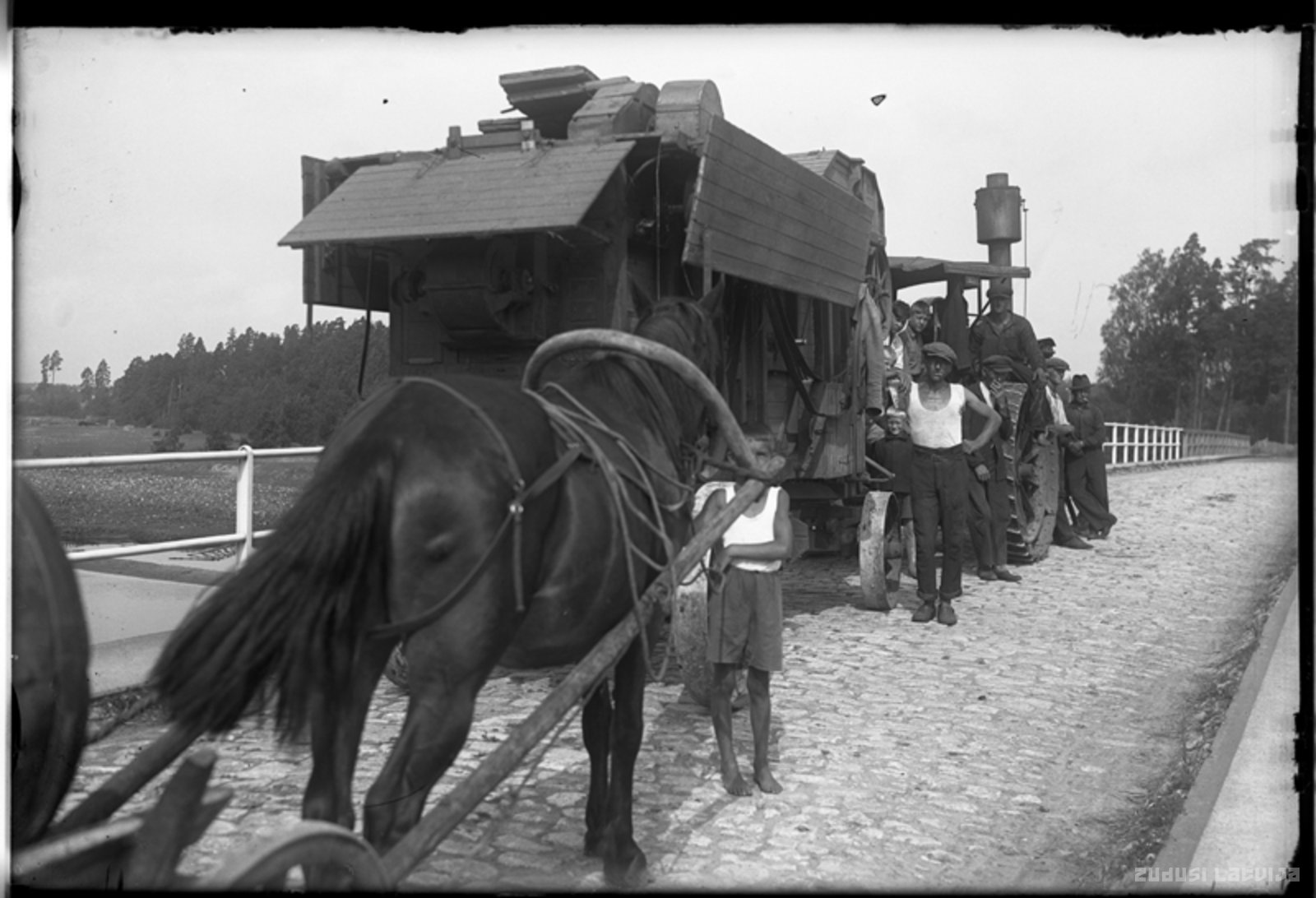 Tvaika kuļmašīnas, tā sauktos dampjus labības kulšanas atvieglošanai ieviesa 19. un 20. gadsimta mijā. Pirms tam kulšanai lietoja kuļmašīnas, kas tika darbinātas ar zirgiem. Labību pļāva ar speciālu pļaujmašīnu, kas vienlaikus bija arī mehānisks kūlīšu sējējs. Dampi kurināja ar malku, visu laiku pielejot klāt ūdeni. Tvaika spiediens kuļmašīnā bija septiņas atmosfēras. Rudziem pat vairāk – astoņas, jo tie smagāk gāja cauri. Dzinēji bija divtaktu un četrtaktu. Dampim uz vienu kloķvārpstas apgriezienu bija divi darba gājieni. Virzuli spieda tvaiks. Kad virzulis aizgāja līdz vidum, tvaika dalītājs izlaida to pa skursteni ārā. Tālāku griešanos nodrošināja spara rats, kas svēra apmēram 200 kilogramus. Pēc tam atkal tvaiks nāca iekšā no otra gala, un atkal dzina virzuli līdz vidum. Un dampis ar garu siksnu darbināja kuļmašīnu. Rudeņos kuļmašīna un tvaika katls tika pārvesti no sētas uz sētu. Labības kulšanai palīgā aicināja kaimiņus, rīkoja talkas. Tās izvērtās par ievērojamiem sabiedriskās dzīves notikumiem. Kaimiņiem tā bija iespēja pēc kopīga darba satikties pie mielasta galda, kur skanēja dziesmas un joki, notika arī danči. Tvaika kuļmašīna, zirga pajūgs un laukstrādnieki uz ceļa Strenčos 20. gadsimta 20. gados