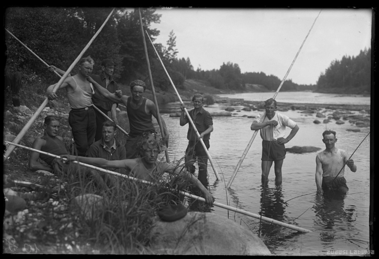Plostnieku grupa ar ķekšiem Gaujas krastā 20. gadsimta 20. gados