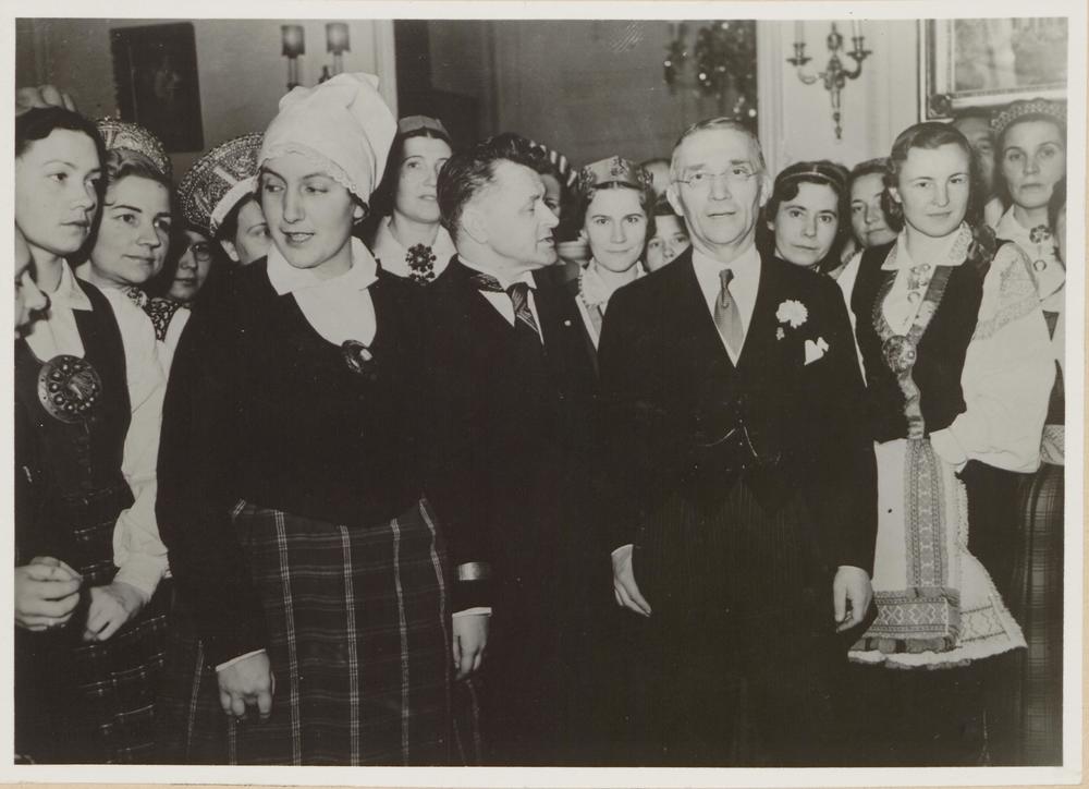 Teodora Reitera kora dalībnieki pieņemšanā Latvijas Republikas vēstniecībā Londonā, 87 Eaton Place. 1. rindā no labās: 2. Latvijas Republikas sūtnis Lielbritānijā Kārlis Zariņš, 3. Latvijas Nacionālās operas diriģents (1918-1944) un kora vadītājs Teodors Reiters.