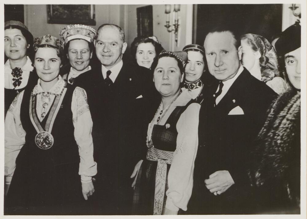 Teodora Reitera kora dalībnieki pieņemšanā Latvijas Republikas vēstniecībā Londonā, 87 Eaton Place, ar mākslas izstādes rīcības komitejas Londonā 1939. gadā locekļiem (2., 4. un 5.). No kreisās: 2. ģenerālis Bērts (Burts), 4. Lielbritānijas parlamenta deputāts, sērs Alfrēds Bossoms (Sir Alfred Bossom, 1957. gadā konservatīvo pārstāvis no Meidstinas Kentā).