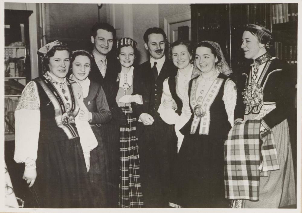 Lielbritānijas preses pārstāvji ar Teodora Reitera kora dalībniecēm tautastērpos, pieņemšanā Latvijas Republikas vēstniecībā Londonā, 87 Eaton Place.