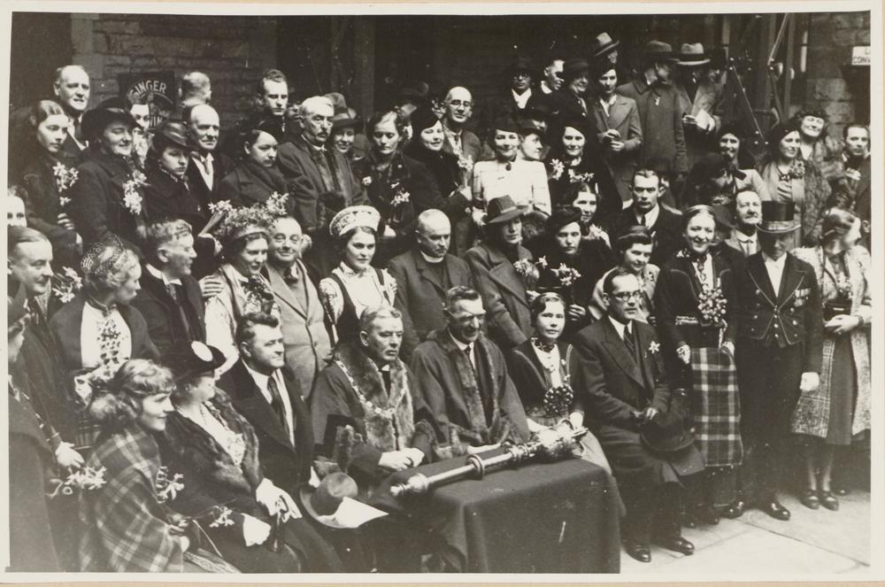 Teodora Reitera kora dalībnieces pieņemšanā pie Monmousšīras grāfistes Abergavenī (Abergavenny) mēra Rosera. 1. rindā no kreisās: 3. Latvijas Nacionālās operas diriģents (1918-1944) un kora vadītājs Teodors Reiters, 4. Rosers. Grupas foto.