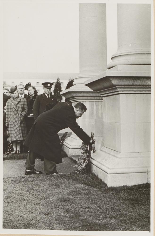 Latvijas Nacionālās operas diriģents (1918-1944) un kora vadītājs Teodors Reiters noliek vainagu pie Velsas Nacionālā kara memoriāla pieminekļa Kārdifā (tagad Kataisa (Cathays) parkā).