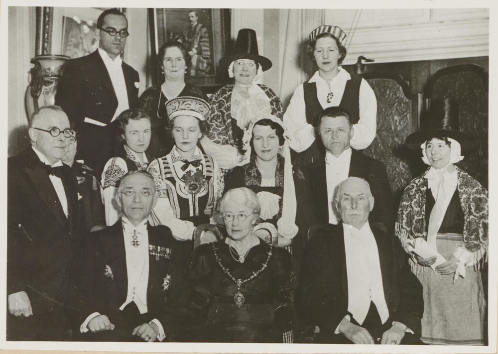 Teodora Reitera kora dalībnieces pieņemšanā Kārdifā. 1. rindā no kreisās: 1. Latvijas Republikas sūtnis Lielbritānijā Kārlis Zariņš, 2. Kārdifas pilsētas mēra (1938-1939, William Gough Howell) sieva Hovela kundze, 3. Latvijas Republikas goda konsuls Kardifā Viljams Dž. Tomass (William J. Thomas). 2. rindā no labās 2. Latvijas Nacionālās operas diriģents (1918-1944) un kora vadītājs Teodors Reiters. Grupas foto.