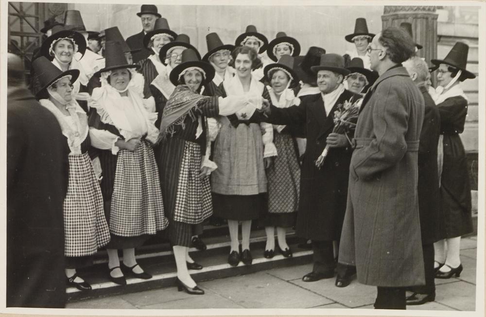 Velsas pilsētas Svonsi (Swansea, arī Svonzi) iedzīvotājas nacionālajos tērpos un Svonsi Universitātes profesors J. Morgans (Thomas John Morgan (?)) pie pilsētas valdes nama sveic (ar ziediem) Latvijas Nacionālās operas diriģentu (1918-1944) un kora vadītāju Teodoru Reiteru.
