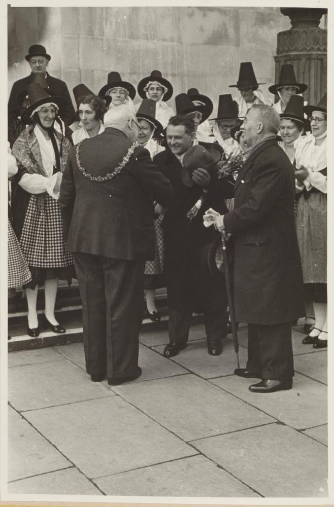 Velsas pilsētas Svonsi (Swansea, arī Svonzi) pilsētas mērs Deivids Ričardss (David Richards) un pilsētas iedzīvotājas nacionālajos tērpos, pie pilsētas valdes nama, sveic Latvijas Nacionālās operas diriģentu (1918-1944) un kora vadītāju Teodoru Reiteru. Priekšplānā no kreisās: 1. Deivids Ričardss, 2. Teodors Reiters.