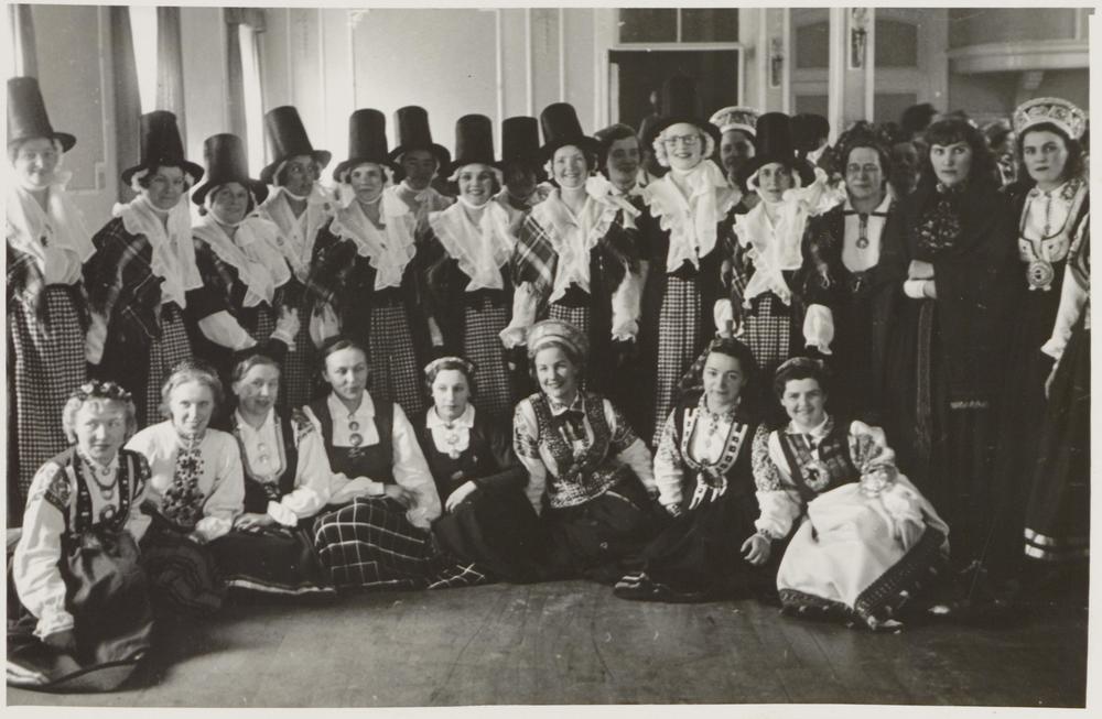 Teodora Reitera kora dalībnieces un Velsas pilsētas Svonsi (Swansea, arī Svonzi) pilsētas iedzīvotājas piedalās nacionālo tērpu skatē. Grupas foto.