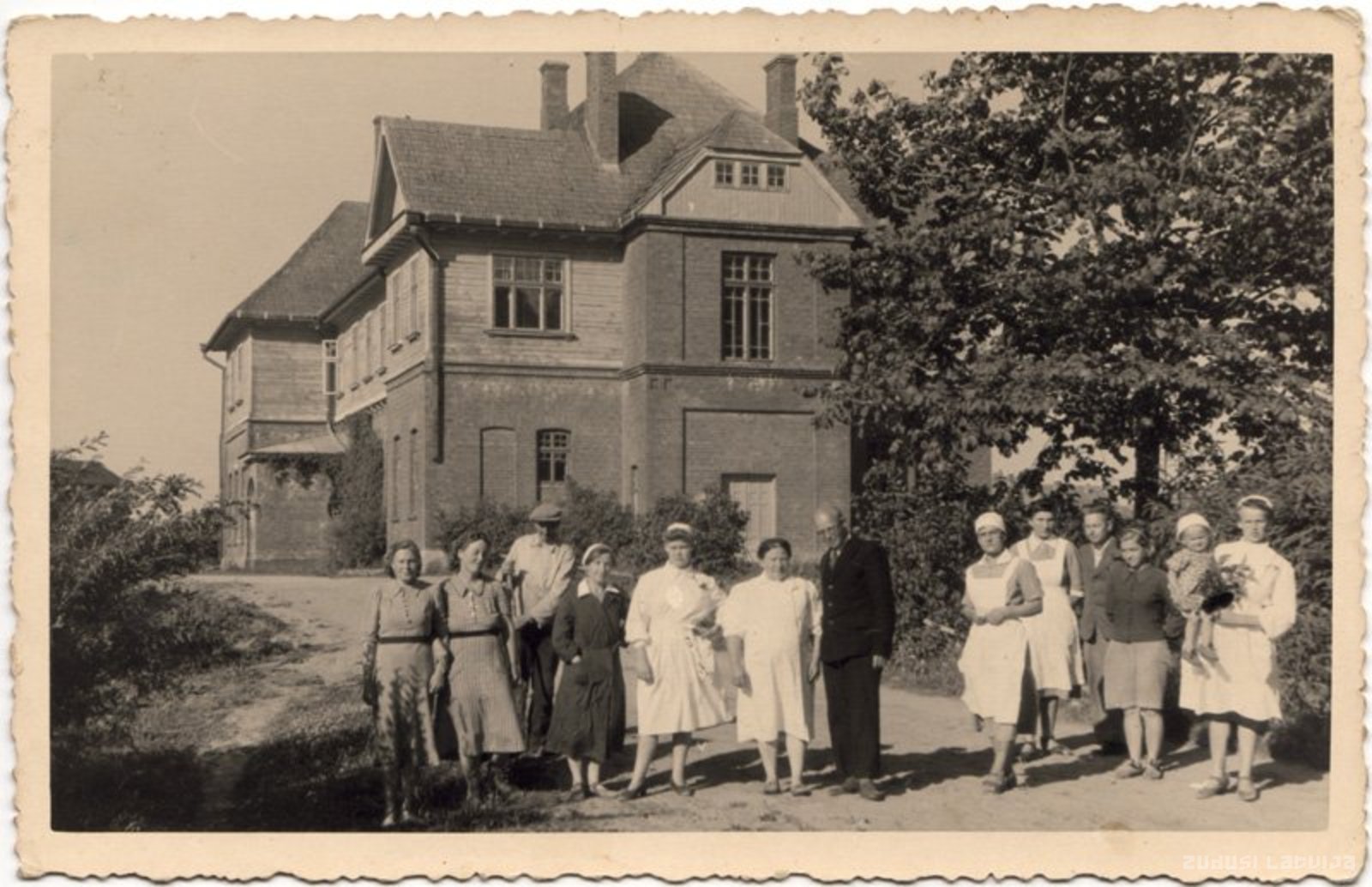 Priekules pamatskolas ēka Otrā psaules kara laikā. Priekšplānā medicīas personāls