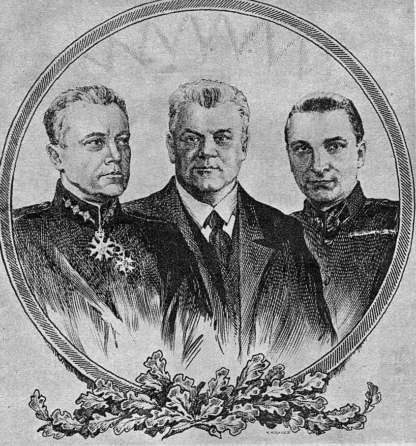 Kārļa Krauzes grafika "15. maija atcerei". No kreisās: 1. kara ministrs (07.12.1931.-05.04.1940.), ģenerālis Jānis Balodis, 2. 4. Saeimas deputāts Kārlis Ulmanis, 3. 4. Saeimas deputāts, iekšlietu ministra biedrs (1934-1937) Alfrēds Jēkabs Bērziņš. Portrets. Laikraksta fotoreprodukcija.