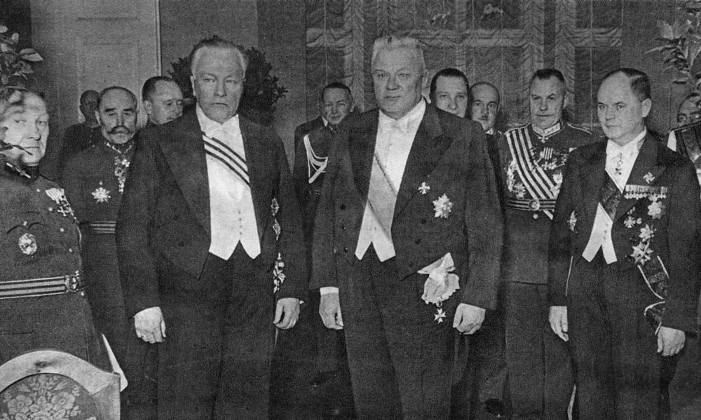 Latvijas Valsts un Ministru prezidents Kārlis Ulmanis ierodas "kalpakiešu" ballē Armijas virsnieku klubā. 1. rindā no kreisās: 1. biedrības "Pulkveža Kalpaka bataljons" valdes loceklis, pulkvedis Ernests Kreišmanis, 2. kara ministrs, ģenerālis Jānis Balodis, 3. Kārlis Ulmanis, 4. finanšu ministrs Ludvigs Ēķis. 2. rindā no kreisās: 1. Vidzemes divīzijas komandieris, ģenerālis Fricis Virsaitis (līdz 1916. gadam Fricis Eltermanis), 2. Ministru prezidenta adjutants, pulkvežleitnants Miervaldis Lūkins, 3. sabiedrisko lietu ministrs Alfrēds Jēkabs Bērziņš,4. Latvijas armijas komandieris, ģenerālis Berķis. 3. rindā no labās: 1. Jelgavas kredītbiedrības valdes loceklis, "Kalpaka bataljona biedrības" biedrs Jānis Kauliņš, 2. Rīgas pilsētas komandants (1932-1940), pulkvedis Valdemārs Malcenieks. Laikraksta fotoreprodukcija.