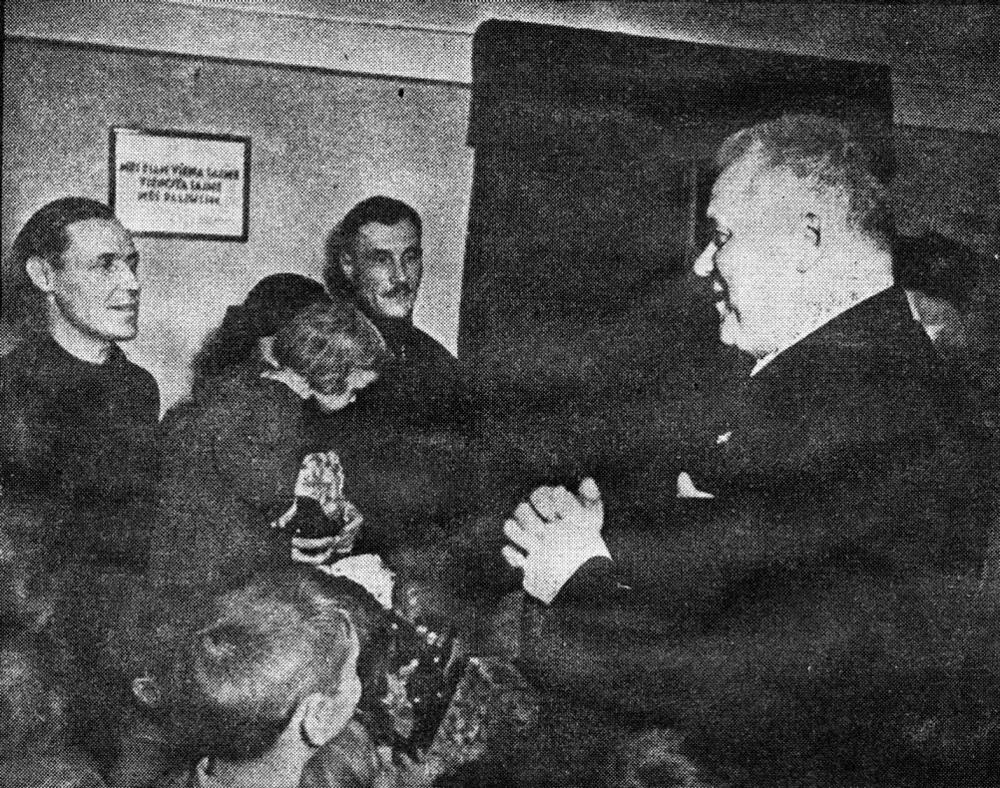 Latvijas Valsts un Ministru prezidents Kārlis Ulmanis (no labās) ar Sarkandaugavas bērniem. Laikraksta fotoreprodukcija.