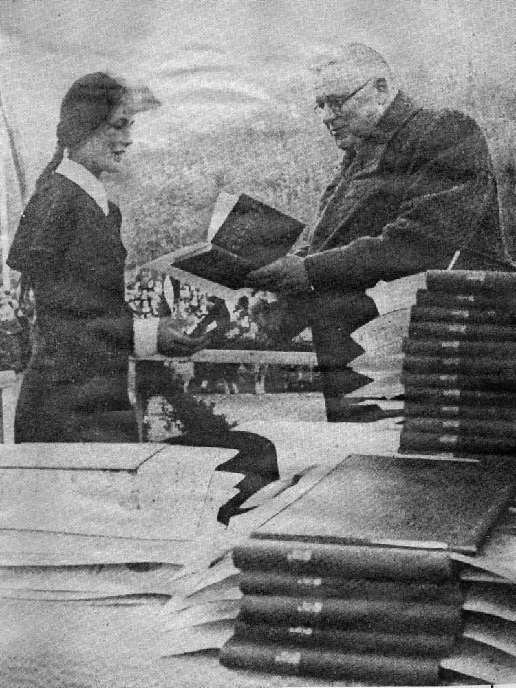 Latvijas Valsts un Ministru prezidents Kārlis Ulmanis (no labās) pasniedz atestātu skolas absolventei. Laikraksta fotoreprodukcija.